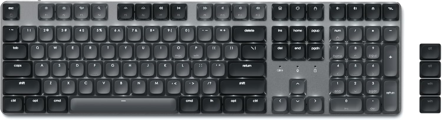 - 108 Keys Low Profile Keyboard ?C The Satechi full size mechanical keyboard features low-profile brown switches, providing unmatched tactile feedback and faster actuation, and removable keycaps that make it easy to clean and customize your keyboard. Designed to strike the perfect balance between typing and gaming, the keyboard??s quieter operation is ideal for office environments or shared spaces